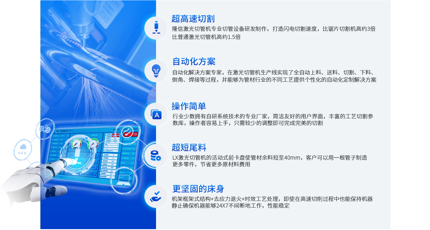管材加工智能生產線,高度靈活的模塊化設計,多環(huán)節(jié)集成一體,實現自動化生產,減少人力成本,提高效率。可根據行業(yè)需求定制,多種智能加工模式助力企業(yè)快速投產。